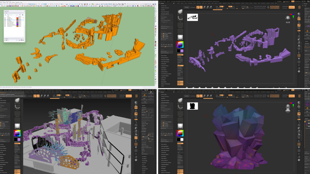 Within SketchUp, all architectural elements were assembled and managed. Meanwhile, other team members were building pieces in their platform of choice.