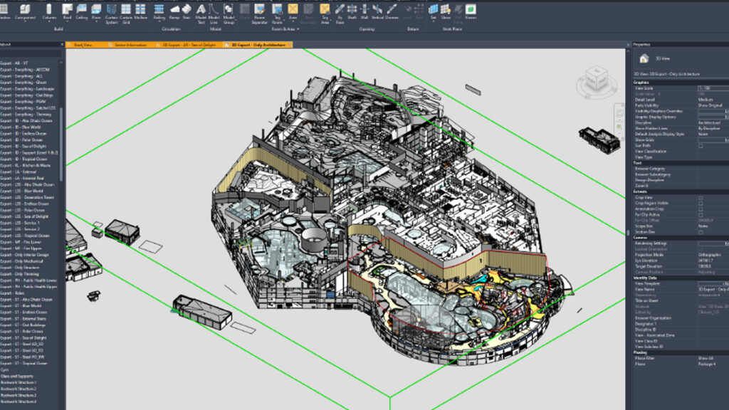 The design of SeaWorld Yas Island, Abu Dhabi was a massive effort and illustrates this approach on a huge scale. The park was designed through a comprehensive digital model that coordinated years of architectural information and thousands of design iterations. Every zone was integrated into a central Revit environment.