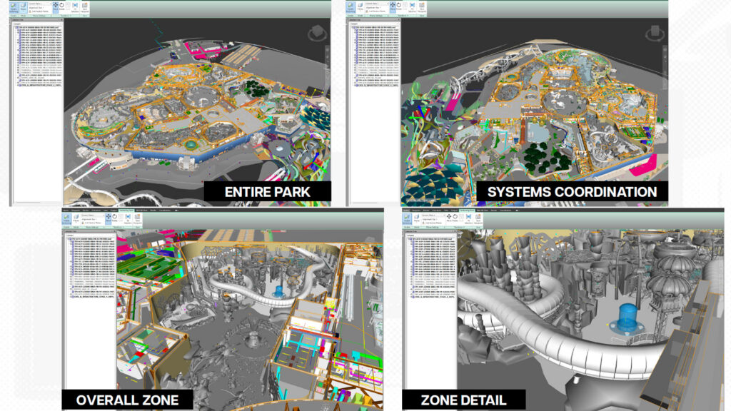 Seven zones of the park were developed simultaneously. Every ride, habitat, show element, and guest experience component was coordinated across disciplines. Yet everything aligned within a single coordinated model.